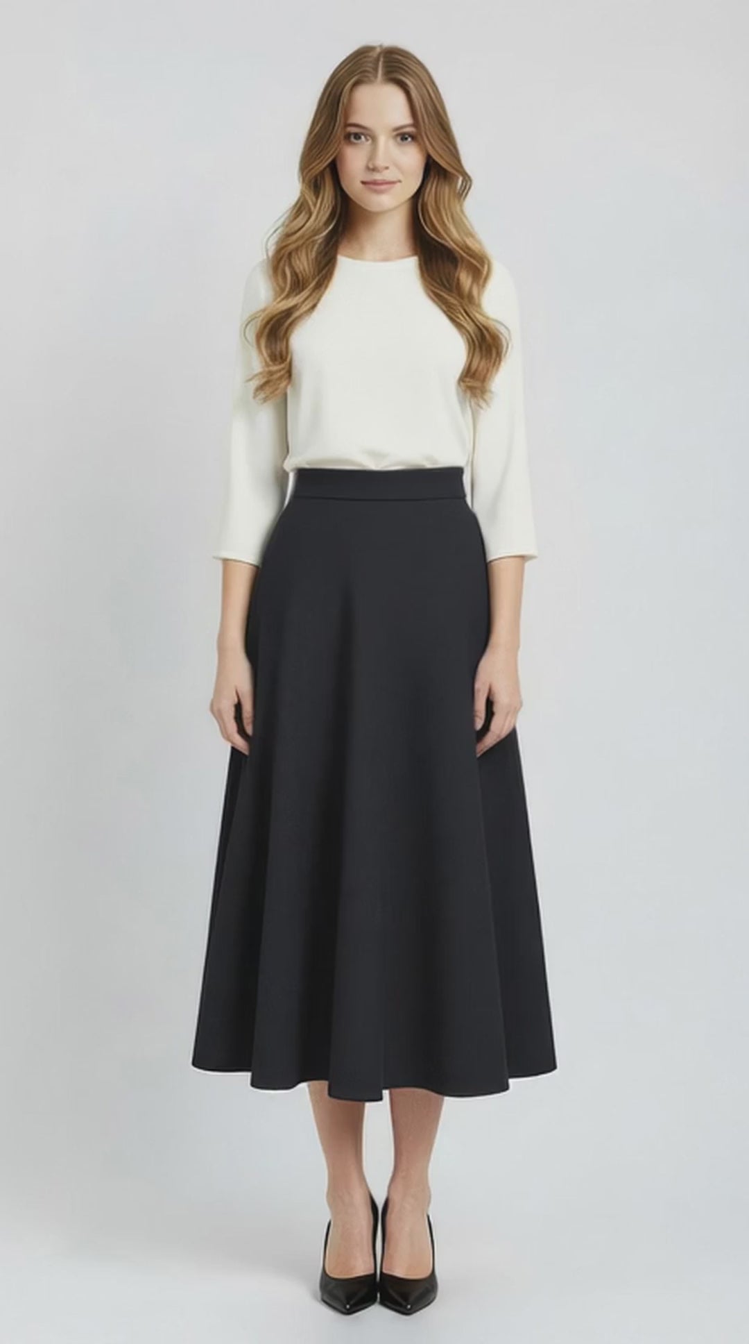 Meet your new winter favorite—a black half circle skirt in midi length with a flared, flowy design. The graceful circle cut creates a mesmerizing flare that dances with every step, while the luxurious wool keeps you wrapped in warmth throughout the season. Perfect for those moments when you want to feel both cozy and utterly captivating.
