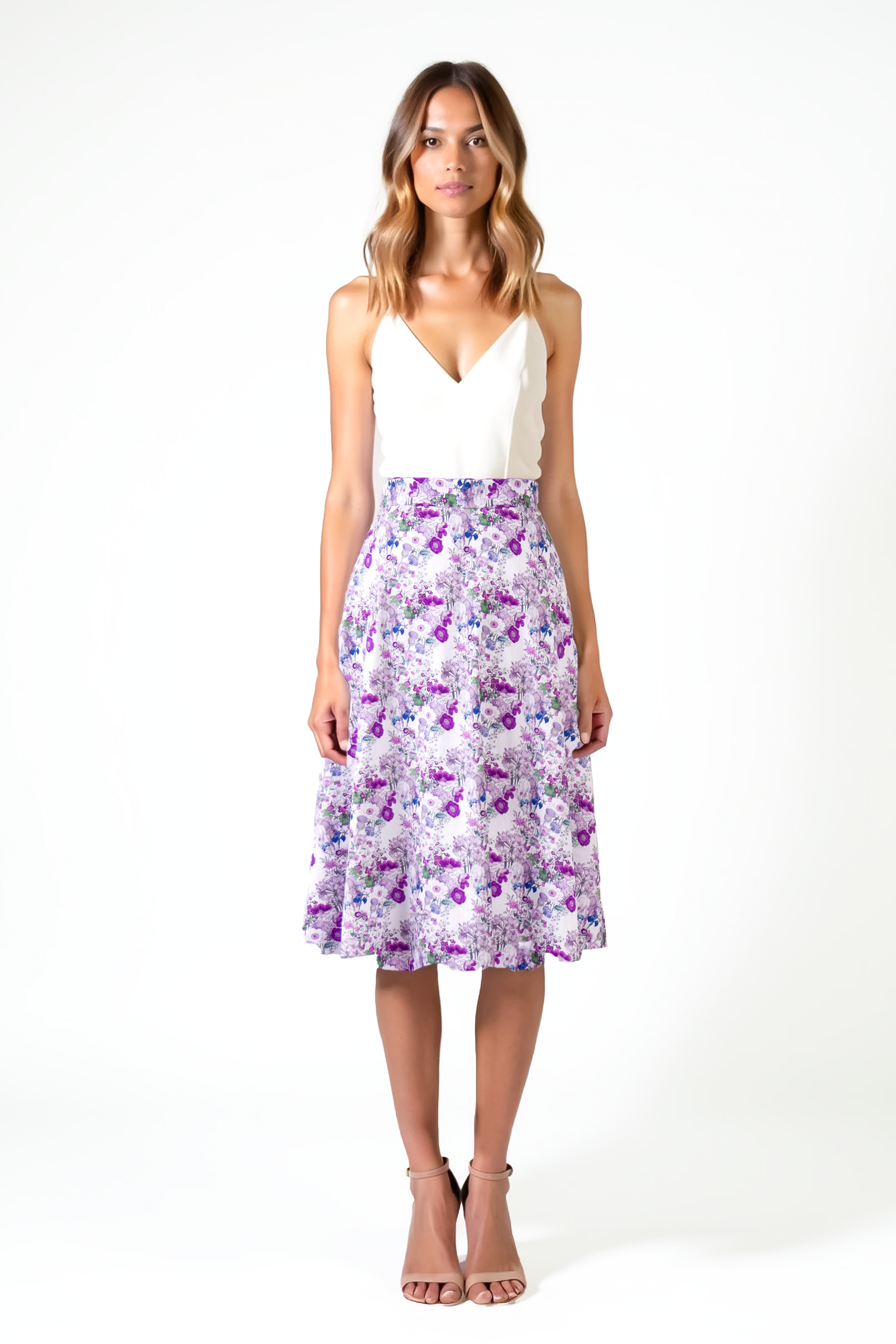 The skirt is made with our custom "Bloomin' Lovely" print in a delicate small scale of 7" repeats. The floral pattern is printed on 100% cotton poplin and the skirt is fully lined with cotton voile.