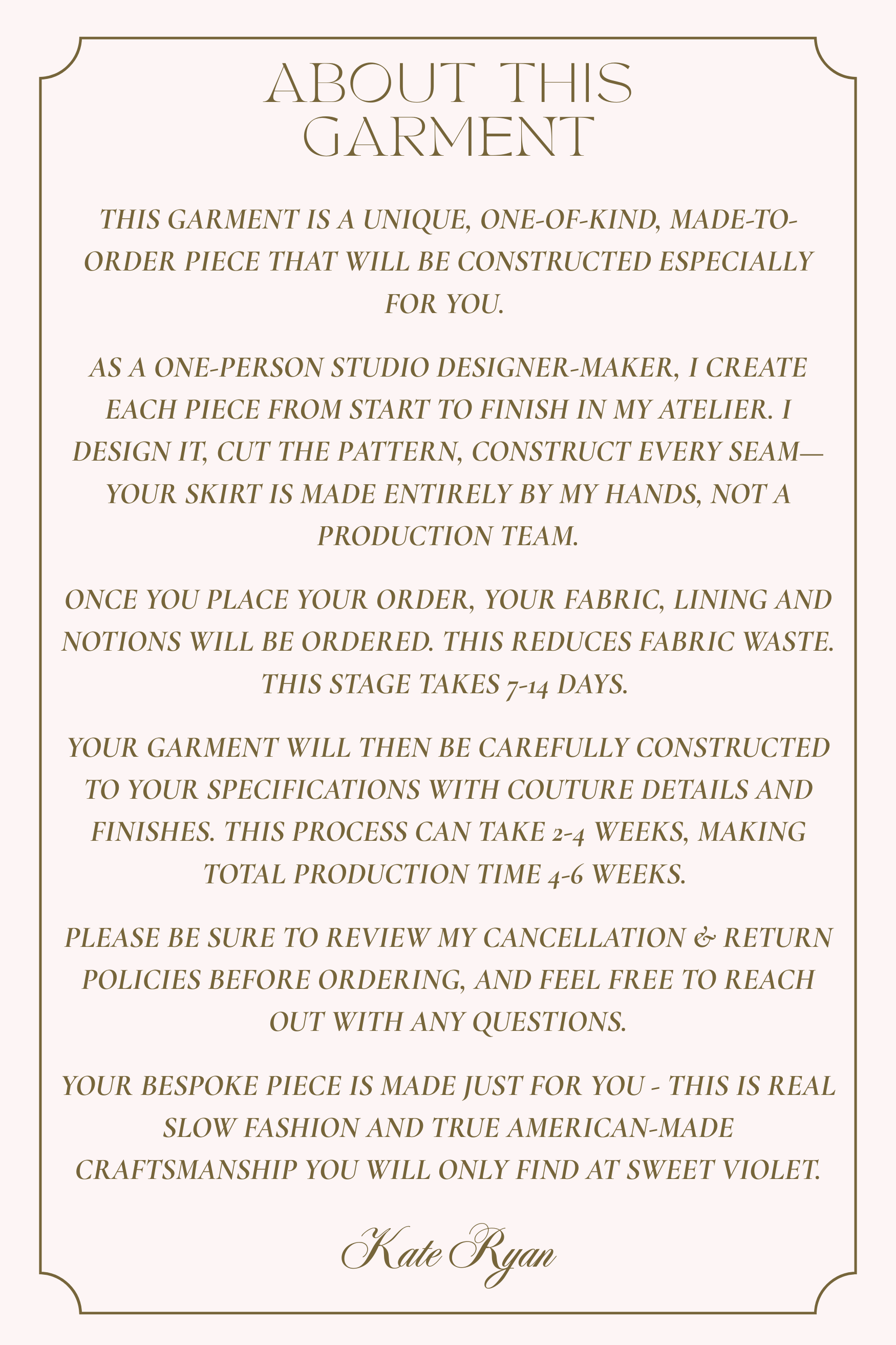 The skirt is handcrafted in the USA, born out of a desire to bring you the highest quality, most long lasting clothing that will be a loved addition to your wardrobe.