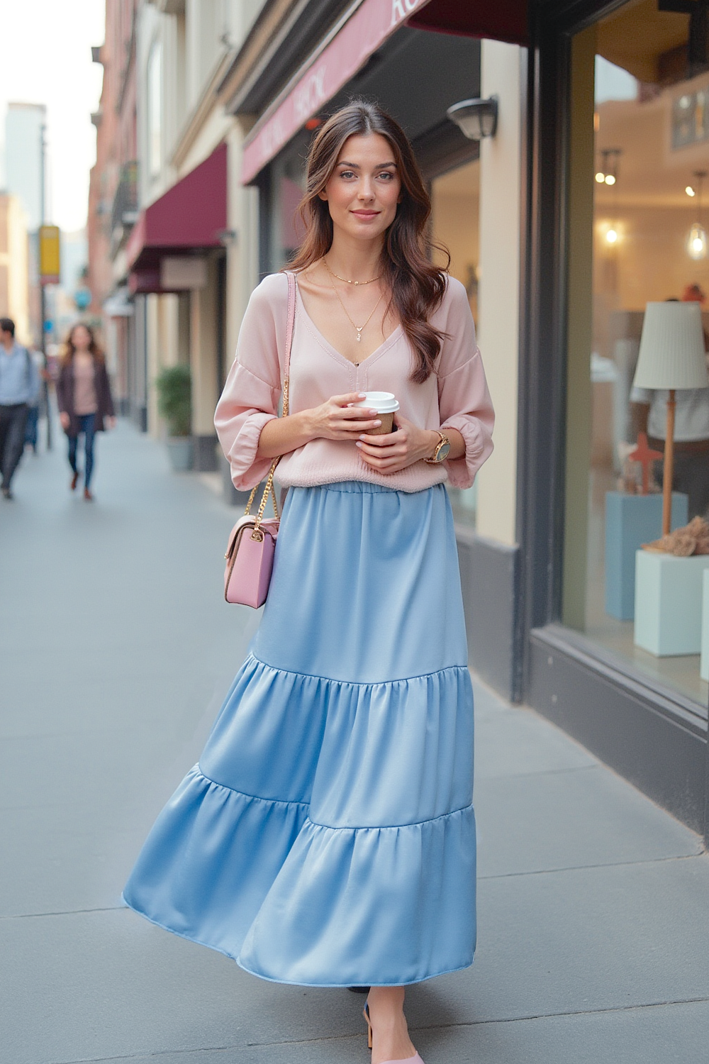 You have to feel the fabric to believe how soft it is! Discover our light blue tiered satin skirt - a 3-tiered, layered design that offers a floaty, airy feel—perfect for a warm summer day.